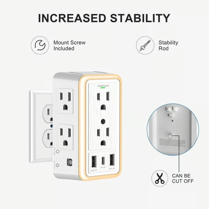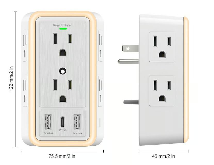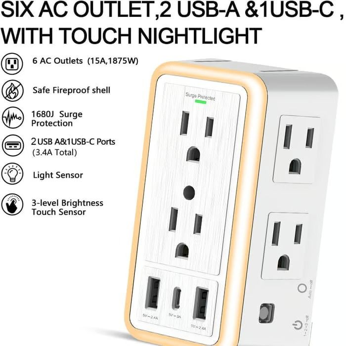 10 IN 1 multifunctional Outlet-6 AC outlets with 2.1 inches long space in between,2USB A & 1USB C Smart Charging Ports(Total 3.4A)Smart night light with touch sensor, three levels ofadjustable brightness let you choose the right amount oflight for your own needs.