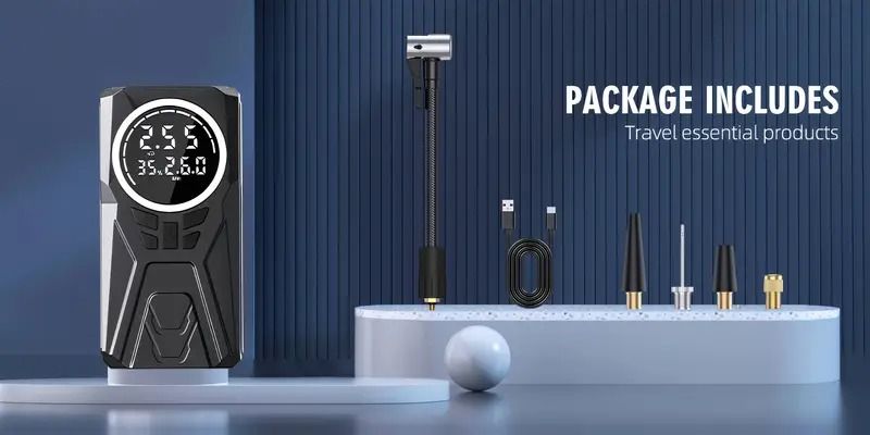 Este inflador de pneus compacto e conveniente é leve, com menos de 2 libras, tornando-o fácil de transportar em um carro, motocicleta ou mochila. É perfeito para uso doméstico, atividades ao ar livre, viagens de estrada e emergências de carro. O pacote contém: 1 Inflador de Pneus, 1 Tubo de Ar, 2 Cones de Bico Universal, 1 Adaptador de Agulha, 1 Adaptador de Válvula Presta, 1 Cabo de Carregamento USB-C e 1 Manual do Usuário.