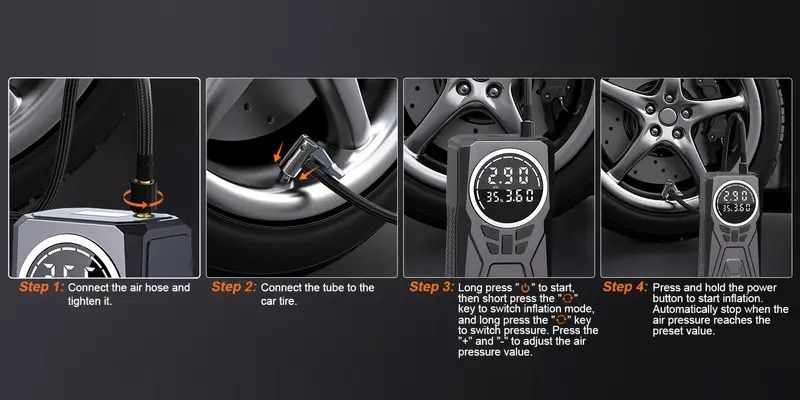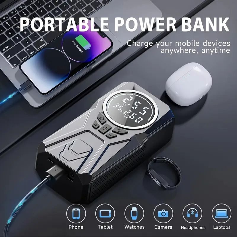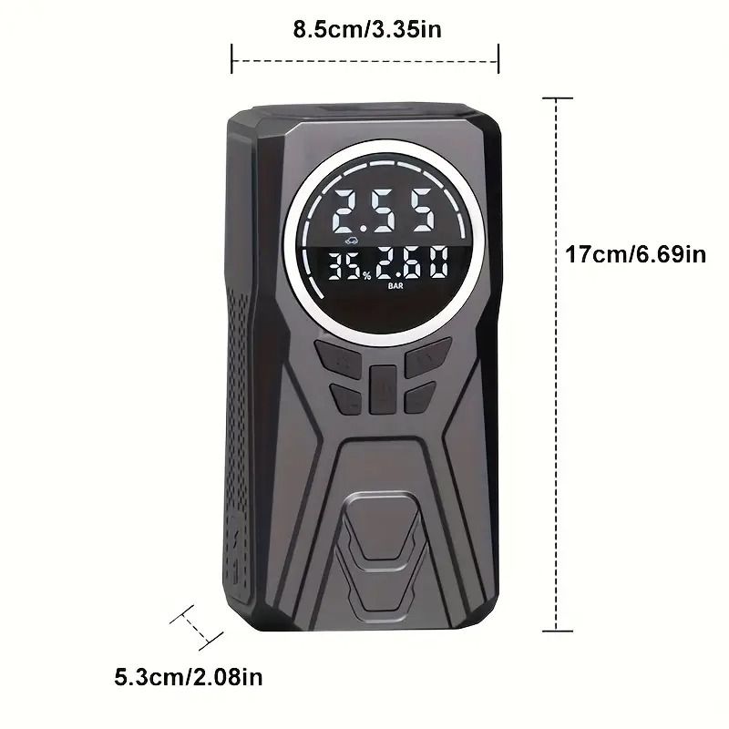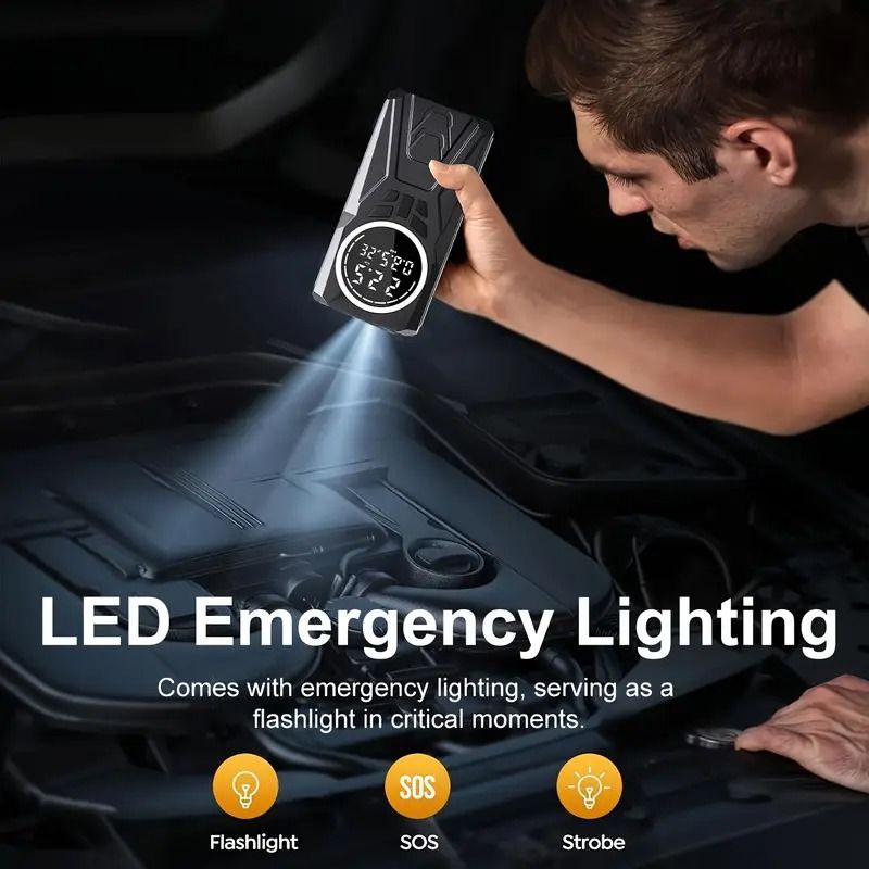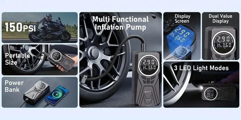 O inflador de pneus portátil serve vários propósitos; não apenas infla os pneus, mas também funciona como um lanterna de emergência com três configurações (luz padrão, SOS e estroboscópio). Além disso, o compressor de ar apresenta portas Type-C e USB para carregar seus dispositivos móveis e outros eletrônicos.